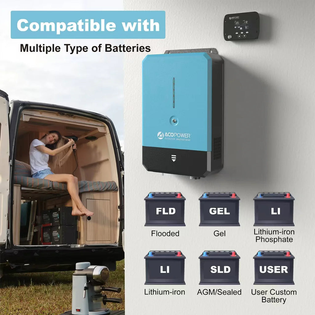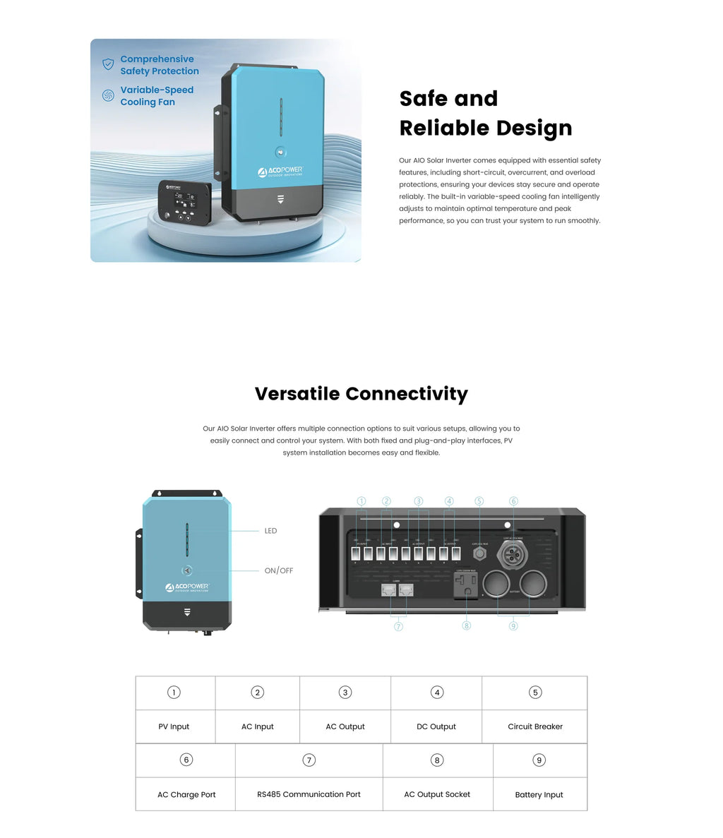 The Acopower AIO Solar Inverter revolutionizes energy management with its four intelligent charging modes, designed to optimize your energy use. Leveraging advanced bidirectional fast charging technology, it outperforms traditional AC-DC and DC-DC charging methods, ensuring rapid battery recharge so you’re always prepared for what’s next.