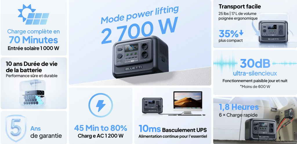Desde aventuras todoterreno hasta un estilo de vida fuera de la red, transforme su potencial energético con BLUETTI AC180T, el primer ecosistema SwapSolar de Bluetti, una fuente de energía de 1800 W con 2 baterías B70 intercambiables para mantener sus alimentos frescos, bebidas frías y dispositivos cargados en cualquier momento y en cualquier lugar.