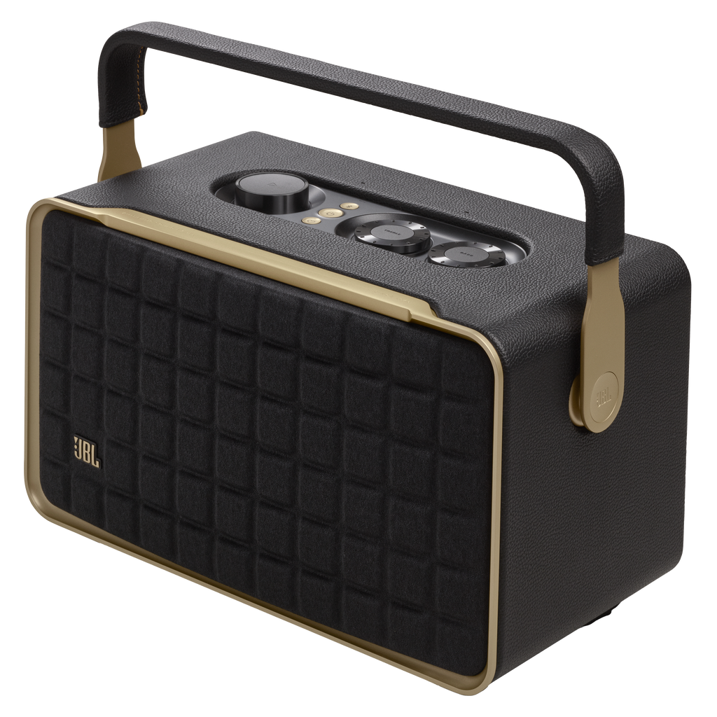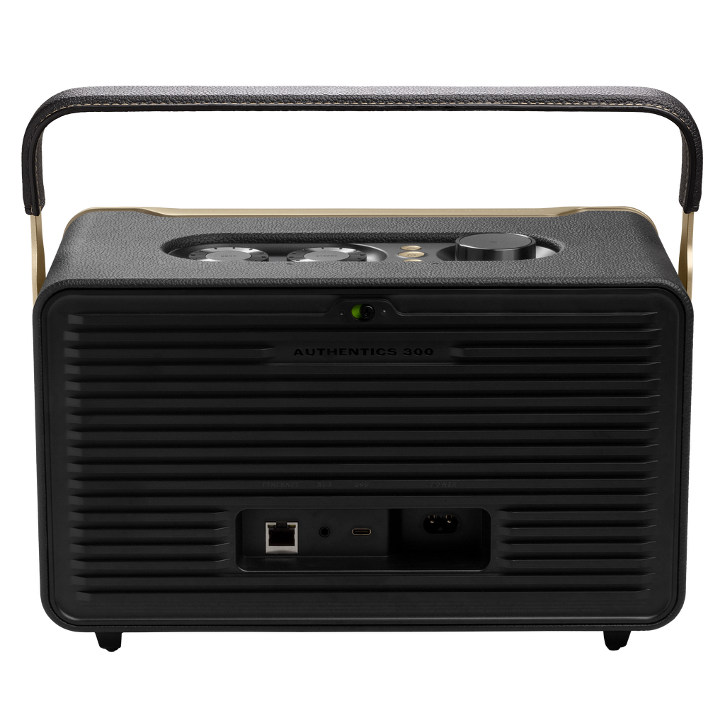 JBL Authentics 300 Wireless Home SpeakerEnjoy retro style amazing audio and built-in dual voice assistants anywhere in your home. With the JBL Authentics 300 speakers leather-like enclosure convenient metal handle and built-in rechargeable battery you can take your music with youfrom the kitchen for your dinner-prep playlist to the bedroom for your wind-down podcast. Its retro 70s-inspired design featuring the iconic Quadrex grille makes a bold statement anywhere you set it down. And so do its wide soundstage crystal-clear highs and deep bass. With Google Assistant and Amazon Alexa available simultaneously you can play your favorite music control your smart home devices and more hands-free using just your voice.Product FeaturesA pair of 1-inch tweeters bring out the details in your music while the full-range 5.25-inch woofer and down-firing 6.5-inch passive radiator deliver deep bassIconic style inspired by classic JBL retro designs in a portable home speaker that looks great in any decor with a convenient cast-aluminum handle custom leather-like enclosure and reimagined Quadrex grille really show the attention paid to each visual detailKeep the music going with up to 8 hours of playtime from a built-in battery and an integrated carrying handle that makes it easy to take your audio anywhereStream music through AirPlay Alexa Multi-Room Music MRM Chromecast built-in and Spotify Connect and leave the room or take a call without the music being interrupted via built-in Wi-FiThe speaker automatically calibrates and optimizes audio performance for every location each time you power it upSeamlessly share playlists by pairing the JBL Authentics 300 with any Bluetooth devicesGoogle Assistant and Amazon Alexa are available simultaneously and gives customers the most freedom and convenience to control more smart home devices play from more music streaming services and get hands-free help from either voice assistantUsing the Google Home app or Amazon Alexa app you can set the mood in every room by connecting two or more speakers to a single playlist and get everybody moving to the same beatUse the JBL One app for even more options to customize EQ settings and find your new favorite song using the integrated music servicesThe Authentics 300 speaker is made with 100 recycled fabric 85 recycled plastics and 50 aluminum and comes in a FSC-certified carton box printed with soy ink