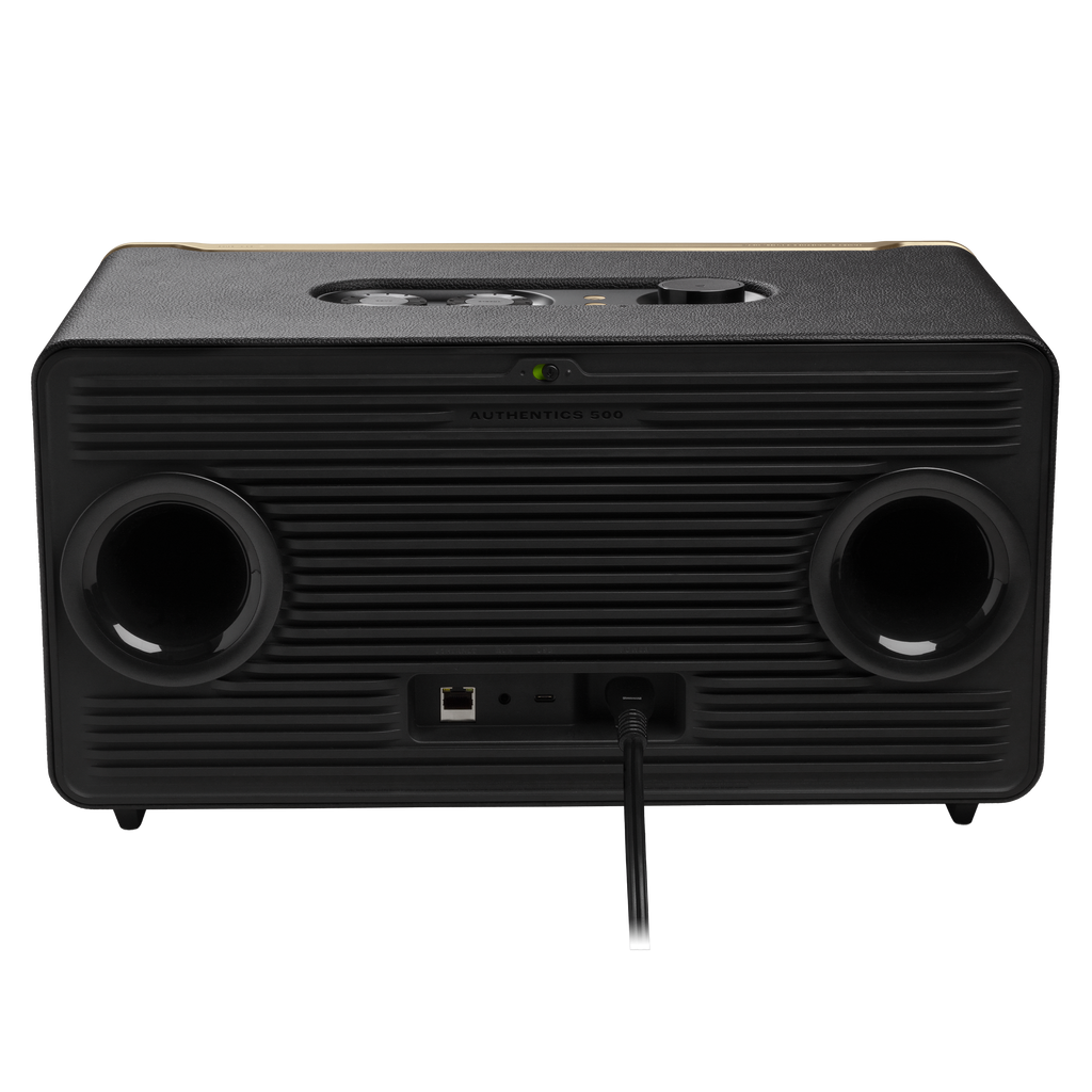 Fill any room with cutting-edge sound and striking retro style with the JBL Authentics 500. Inspired by JBL's iconic 1970s designs, the speaker features a Quadrex grille and custom leather-like enclosure updated for the 21st century with advanced sound and control technologies. Enjoy high-definition, lifelike audio with Dolby Atmos Music, powered by aluminum tweeters and a patented SlipStream bass port. Google Assistant and Amazon Alexa are available simultaneously for hands-free music playback, smart home control, and more.